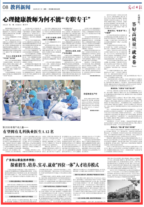 4月11日,《光明日报》在08版刊发《广东松山职业技术学院:探索招生、培养、实习、就业“四位一体”人才培养模式》一文,对我校从推进分类招生、贯通人才培养、产教融合实习、多举措促就业四个方面探索“四位一体”人才培养模式进行了宣传报道。